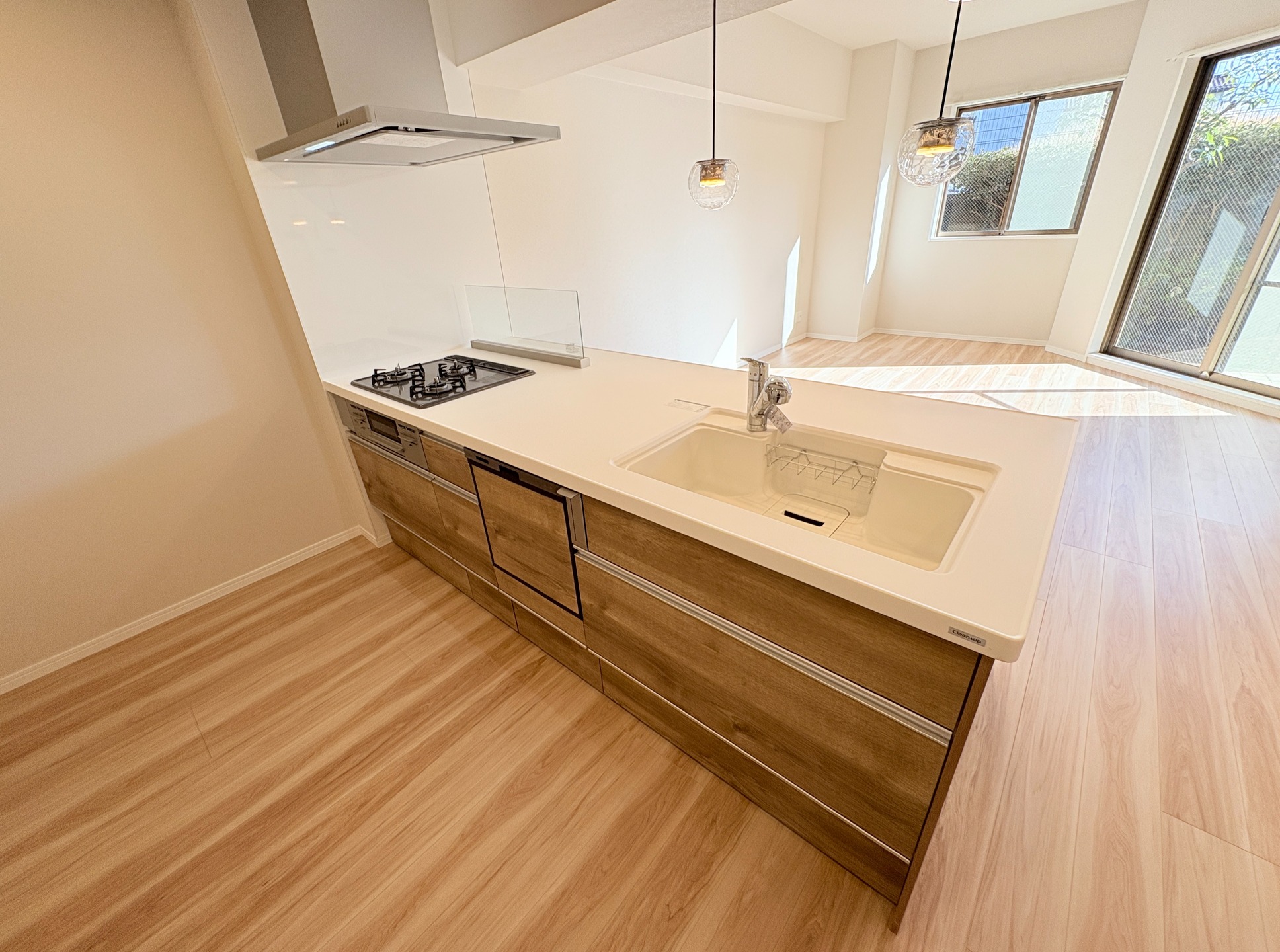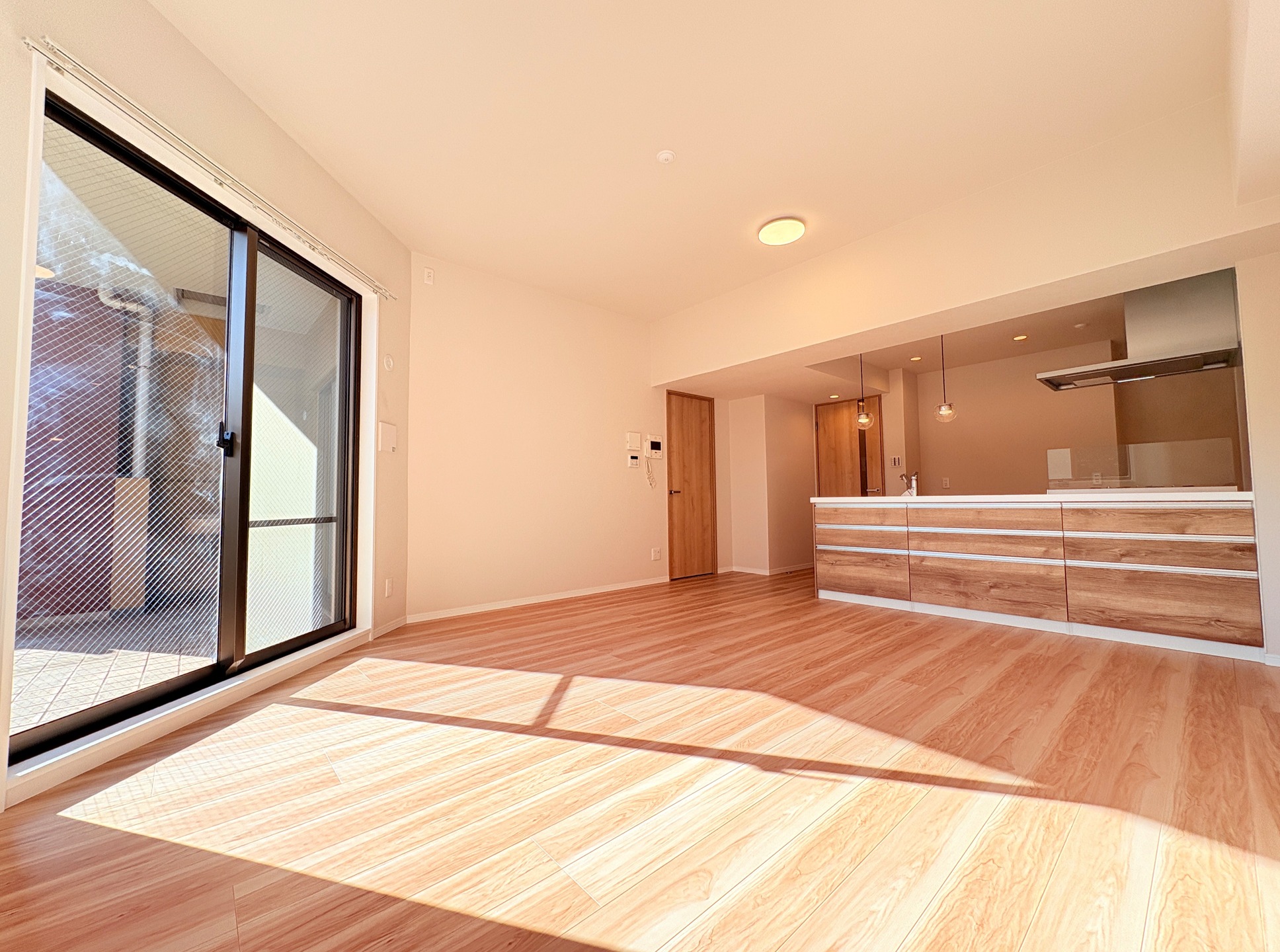 ■リビング全体を見渡せるフラット対面キッチン+ペンダントライトを採用